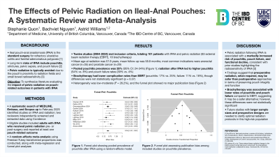 Pelvic radiation in patients with IPAA is associated with adverse pouch outcomes. This review found that pouchitis and pouch failure were more common with radiotherapy given after IPAA than before. While brachytherapy showed lower complication rates than external beam, differences were not statistically significant. These findings highlight the need for individualized decision-making and further research to guide radiation planning in patients with IPAA.