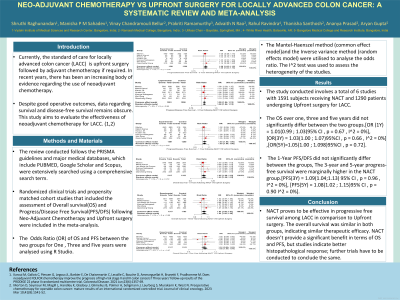 The study conducted involves a total of 6 studies with 1591 subjects receiving NACT and 1290 patients undergoing Upfront surgery for LACC. The Overall survival over one, three and five years did not significantly vart between the two groups.(OR (1Y) = 1.01(0.99 ; 1.03)95% CI , p = 0.67 , I^2 = 0%),(OR(3Y) = 1.03(1.00 ; 1.07)95%CI , p = 0.66 , I^2 = 0%),(OR(5Y)=1.05(1.00 ; 1.098)95%CI , p = 0.72). The 1-Year Progress free survival /disease-free survival did not significantly differ between the groups, The 3-year and 5-year progress-free survival were marginally higher in the NACT group.(PFS(3Y) = 1.09(1.04;1.13) 95% CI , p = 0.96 , I^2 = 0%),(PFS(5Y) = 1.08(1.02 ; 1.15)95% CI , p = 0.90 I^2 = 0%)