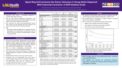 Colorectal cancer (CRC) remains the second leading cause of cancer-related mortality in the USA and is increasingly diagnosed in younger adults (aged < 50 years). CRC can have diverse histological presentations, most commonly adenocarcinoma (AC), signet ring cell carcinoma (SRCC), and mucinous adenocarcinoma (MA). Prior literature has shown that CRC with SRCC histology in older adults ( >50 years) has poor outcomes. CRC in young adults (< 50 years) is also associated with poorer survival outcomes, data on differences in clinical outcomes based on different histopathological subtypes are limited.