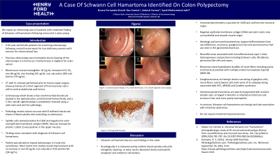 Schwann cell hamartomas are rare findings in the colon with pathology revealing islands with poorly delineated margins and bland spindle cells extending to the submucosa. Immunohistochemistry is positive for S100 and confirms the neuronal origin, and negative EMA and actin stain rules out epithelial and smooth muscle origin. The distinction is critical due to common GI manifestations of neurofibromatosis type 1 associated with neurofibromas and leiomyomas, in addition to neuromas or ganglioneuromas which present with a heterogeneous cellular composition. Schwann cell hamartomas are benign, lack association with inherited syndromes and do not require treatment beyond excision.