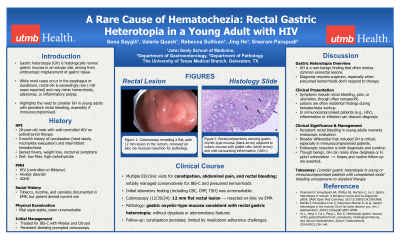 Rectal gastric heterotopia is a rare but important differential for unexplained rectal bleeding in young patients. It may lead to symptoms such as local irritation, ulceration, or bleeding from acid secretion by ectopic parietal cells. This case highlights the diagnostic value of colonoscopy in young patients with persistent bleeding, particularly in the immunocompromised, given its broad differential. Histologic evaluation is necessary, as endoscopic appearance may mimic other lesions. While GH is typically benign, surveillance may be considered if symptoms persist or dysplasia develops. This case emphasizes the importance of maintaining a broad differential when evaluating persistent rectal bleeding in young adults. Rectal gastric heterotopia, although rare, should be considered once more common causes are excluded. Colonoscopic evaluation and histopathologic confirmation are essential for accurate diagnosis and management.