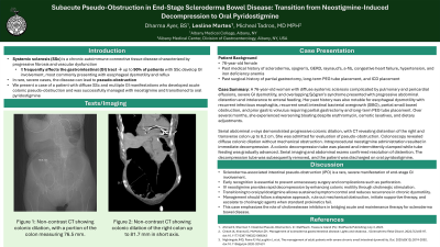 A 76-year-old woman with diffuse SSc complicated by pulmonary and pericardial effusions, severe GI dysmotility, and overlapping Sjögren’s syndrome presented with progressive abdominal distention and intolerance to enteral feeding. Her past history was also notable for esophageal dysmotility with recurrent infectious esophagitis, small intestinal bacterial overgrowth (SIBO), partial small bowel obstruction, and prior gastric volvulus requiring partial gastrectomy and long-term PEG tube placement. Over several months, she experienced worsening bloating despite erythromycin, osmotic laxatives, and dietary adjustments.
