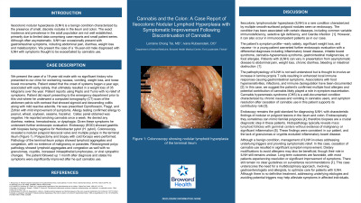 A 19-year-old male with no medical history presented to our clinic for worsening nausea, vomiting, weight loss, and loose bowel movements for 1 year. Symptoms were associated with early satiety, that ultimately resulted in a weight loss of 35 kg. Prior CT scan of the abdomen/pelvis with contrast showed sigmoid and descending colitis along with mild reactive adenitis for which he was prescribed antibiotics with no improvement. Allergy testing confirmed allergy to peanut, wheat, soybean, sesame, hazelnut. He also reported smoking cannabis once a week. Colonoscopy revealed multiple polyps in the terminal ileum (Figure 1). Pathology of the terminal ileum polyps showed lymphoid aggregates and congestion with no evidence of malignancy or parasites. Rectosigmoid polyp pathology showed lymphoid aggregates and congestion as well with no granulomas, cryptitis, increased intraepithelial lymphocytes, or viral cytopathic changes consistent with Ileocolonic lymphonodular hyperplasia. At one month follow-up his symptoms were significantly improved after cannabis cessation.
