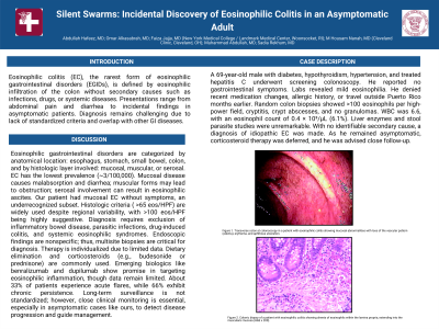 A 69-year-old male with diabetes, hypothyroidism, hypertension, and treated hepatitis C underwent screening colonoscopy. He reported no gastrointestinal symptoms. Labs revealed mild eosinophilia. He denied recent medication changes, allergic history, or travel outside Puerto Rico months earlier.