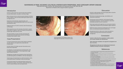 Ischemic colitis develops when blood supply fails to meet the metabolic demands of the colon. Risk factors include advanced age, comorbidities, and vasoactive medications. Colonoscopy is key for diagnosis, with hallmark findings including the stripe sign—an anti-mesenteric, linear ulcer indicating mesenteric border involvement. Most cases resolve with supportive care, but severe ischemia or right-sided involvement may necessitate surgical resection. Predictors of poor outcomes include age over 75, multi-organ failure, and elevated preoperative lactate levels. Recognizing ischemic colitis early in high-risk patients is critical to ensuring prompt intervention and optimal management.
