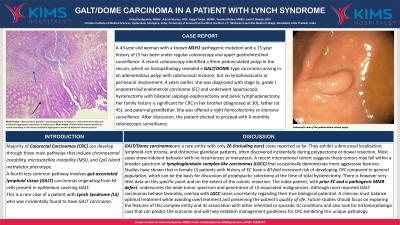 A 43-year-old woman with a known MLH1 pathogenic mutation and a 15-year history of LS has been under regular colonoscopic and upper gastrointestinal surveillance. A recent colonoscopy identified a 9mm pedunculated polyp in the cecum, which on histopathology revealed a GALT/DOME-type carcinoma arising in an adenomatous polyp with submucosal invasion, but no lymphovascular or perineural involvement. 4 years earlier, she was diagnosed with stage Ia, grade I endometrioid endometrial carcinoma (EC) and underwent laparoscopic hysterectomy with bilateral salpingo-oophorectomy and pelvic lymphadenectomy. Her family history is significant for CRC in her brother (diagnosed at 30), father (at 45), and paternal grandfather. She was offered a right hemicolectomy or intensive surveillance. After discussion, the patient elected to proceed with 6-monthly colonoscopic surveillance.