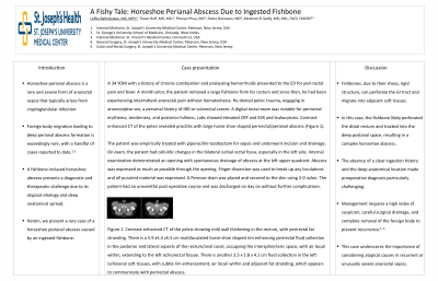 A 34-year-old man with a history of chronic constipation and prolapsing hemorrhoids presented to the ED for peri-rectal pain and fever. A month prior, the patient removed a large fishbone from his rectum and since then, he has been experiencing intermittent anorectal pain without hematochezia. He denied pelvic trauma, engaging in anoreceptive sex, a personal history of IBD or colorectal cancer. A digital rectal exam was notable for perirectal erythema, tenderness, and posterior fullness. Labs showed elevated CRP and ESR and leukocytosis. Contrast-enhanced CT of the pelvis revealed proctitis with large horse-shoe shaped perirectal/perianal abscess (Figure 1).