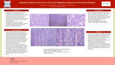 Patient 1: A 61-year-old male with no significant medical history presented with abdominal pain, non-bloody dry heaving, and diarrhea. Imaging showed partial colonic obstruction, and he underwent an extended right hemicolectomy following failed conservative management. Pathology confirmed medullary carcinoma with MLH1 and PMS2 loss, but BRAF mutation testing was negative. He recovered after postoperative ileus and was discharged for outpatient oncology follow-up.