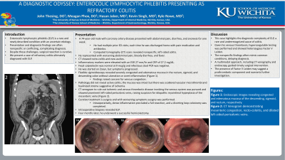 This case highlights the diagnostic complexity of ELP, a rare and underrecognized cause of colitis. Given his venous thrombosis, hypercoagulable testing was performed and showed heterozygous Factor V Leiden. The nonspecific findings often mimic common conditions, delaying diagnosis. A multimodal approach, including CT venography and endoscopy, guided timely surgical intervention. The presence of Factor V Leiden may suggest a prothrombotic component and warrants further investigation.