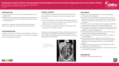A 38 year-old-male with fistulizing CD, diagnosed in 2014 and previously treated with mesalamine monotherapy, presented with worsening abdominal pain. CT enterography revealed a fistula between the distal ileum and sigmoid colon, along with a fistula involving the distal ileum alone. There was moderate to severe right hydroureteronephrosis adjacent to inflammatory changes from the fistulas. There was mild wall thickening of the terminal ileum (TI). The findings are suggestive of external compression of the ureter from the ileocolonic fistulas.