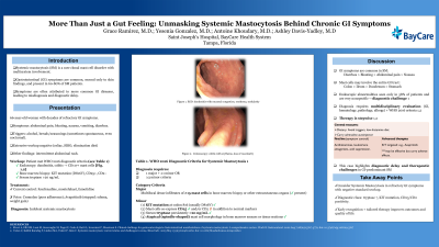 Endoscopic evaluation revealed duodenitis and colitis with histologic features raising suspicion for systemic mastocytosis with CD117+ for mast cells. A bone marrow biopsy later reinforced the diagnosis, demonstrating an activating KIT mutation. Tryptase levels were persistently elevated ( >20 ng/mL). These findings fulfilled both the major and minor diagnostic criteria for systemic mastocytosis, specifically the indolent variant.