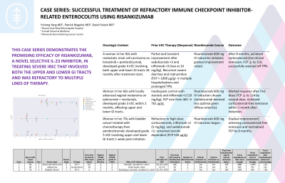 Immune checkpoint inhibitor-related enterocolitis (irEC) is a common complication of immune checkpoint inhibitors (ICI) and is typically managed with corticosteroids, infliximab, and vedolizumab. Limited data exist for additional therapies and the management of patients refractory to these agents. In this report, we present three patients treated with risankizumab (anti-IL23 therapy) for refractory irEC.