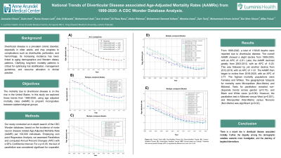 From 1999-2020, a total of 115045 deaths were reported due to diverticular disease. The overall AAMR showed a slight decline from 1999-2003, with an APC of -2.61. Later, the AAMR declined greatly from 2003-2012, with an APC of -5.20. This was followed by yet another decline from 2012-2018, with an APC of -1.91. The AAMR then began to incline from 2018-2020, with an APC of 3.77. The highest mortality populations were Females and Whites. The geographical hotspots for mortality were Micropolitan (Non-Metro) and Midwest. Tests for parallelism revealed non-disparate trends across gender (p=0.15), and Black and White races (p=0.06). However, the parallelism test in Midwest versus West (p=0.001), and Micropolitan (Non-Metro) versus Noncore (Non-Metro) was significant (p=0.02).There is a recent rise in diverticular disease associated mortality. Further, the disparity among the demographic variables warrants more investigation, and the planning of targeted interventions.