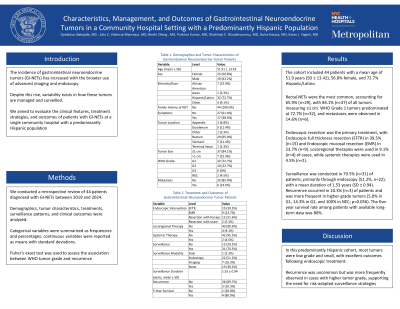The cohort included 44 patients with a mean age of 51.9 years (SD ± 13.42), 56.8% female, and 72.7% Hispanic/Latino. Rectal NETs were the most common, accounting for 65.9% (n=29), with 84.1% (n=37) of all tumors measuring ≤1 cm. WHO Grade 1 tumors predominated at 72.7% (n=32), and metastases were observed in 14.6% (n=6). Endoscopic resection was the primary treatment, with Endoscopic full thickness resection (EFTR) in 39.5% (n=15) and Endoscopic mucosal resection (EMR) in 23.7% (n=9). Locoregional therapies were used in 9.1% (n=4) of cases, while systemic therapies were used in 4.5% (n=2). Surveillance was conducted in 70.5% (n=31) of patients, primarily through endoscopy (51.2%, n=22), with a mean duration of 1.53 years (SD ± 0.94). Recurrence occurred in 10.3% (n=3) of patients and was more frequent in higher-grade tumors (5.0% in G1, 14.3% in G2, and 100% in NEC; p = 0.056). The five-year survival rate among patients with available long-term data was 80%.