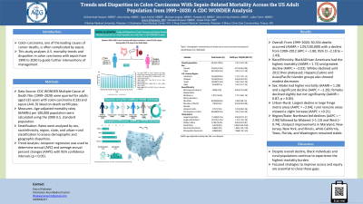 Using CDC WONDER data (1999–2020), we analyzed deaths in adults aged 25+ with ICD-10 codes C18 (colon carcinoma) and A41.9 (sepsis). Age-adjusted mortality rates (AAMRs) per 100,000 were stratified by sex, race/ethnicity, region, state, and urban-rural classification. Joinpoint regression calculated annual percent changes (APCs) and average annual percent changes (AAPCs) with 95% CIs (p< 0.05).