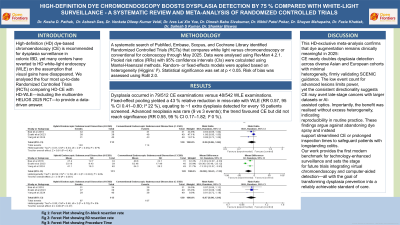 This HD-exclusive meta-analysis confirms that dye augmentation remains clinically meaningful in 2025: CE nearly doubles dysplasia detection across diverse Asian and European cohorts with minimal heterogeneity, firmly validating SCENIC guidance. The low event count for advanced lesions limits power, yet the consistent directionality suggests CE may avert late-stage cancers with larger datasets or AI-assisted optics. Importantly, the benefit was realised without excess heterogeneity, indicating reproducibility in routine practice. These findings argue against abandoning dye spray and instead support streamlined CE or prolonged inspection times to safeguard patients with longstanding colitis. Our work provides the first modern benchmark for technology-enhanced surveillance and sets the stage for future trials integrating virtual chromoendoscopy and computer-aided detection—all with the goal of transforming dysplasia prevention into a reliably achievable standard of care.