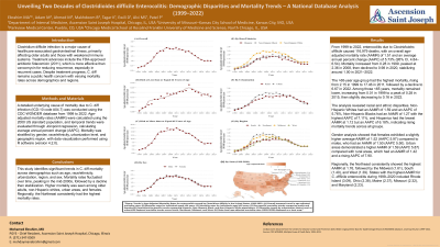 From 1999–2022, enterocolitis due to Clostridium difficile caused 116,979 deaths, with an overall age-adjusted mortality rate (AAMR) of 1.51. Mortality rose from 0.28 in 1999, peaked at 2.36 in 2008, then declined to 0.98 in 2020, stabilizing around 1.00 in 2021–2022. The >65 years age group had the highest mortality, increasing from 2.15 in 1999 to 17.46 in 2011, then declining to 6.67 in 2022. For those < 65 years, mortality remained lower, rising from 0.01 in 1999 to a peak of 0.28 in 2015, then decreasing to 0.16 in 2022. The analysis highlighted racial and ethnic disparities. Non-Hispanic Whites had an AAMR of 1.59, Non-Hispanic Blacks 1.27, and Hispanics 1.12. Gender analysis showed females with a slightly higher average AAMR of 1.52 compared to males at 1.50. Urban areas had an AAMR of 1.59 compared to 1.42 in rural areas. Regionally, the Northeast had the highest AAMR at 1.76, followed by the Midwest (1.61), South (1.40), and West (1.39). Rhode Island (3.09), Ohio (2.38), Maine (2.37), Missouri (2.32), and Maryland (2.23) had the highest AAMR.