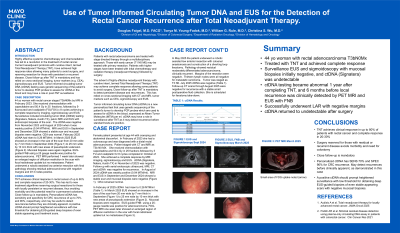 Neoadjuvant protocols with curative intent, termed Total Neoadjuvant Therapy (TNT), have achieved high complete response rates allowing many patients to avoid surgery, and reserving resection for those with persistent or recurrent disease. Close follow-up is mandatory and relies on cross sectional imaging, tumor markers, sigmoidoscopy and EUS. Tumor informed circulating tumor DNA (ctDNA) testing uses genetic sequencing of the patient’s tumor to develop PCR probes to assess for ctDNA in the blood and may have a role in post-TNT surveillance