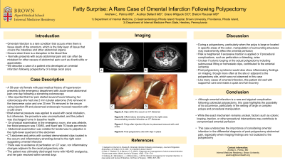 Omental infarction is an uncommon complication following colonoscopy, and its exact cause is unknown. During a polypectomy, manipulation of surrounding structures may inadvertently affect the omental perfusion; particularly if excess traction is placed on the colon. It is unclear if colonic looping or the actual polypectomy including submucosal lifting or hemostatic clips, contributed to the omental ischemia. Post-polypectomy syndrome would show inflammatory findings on imaging, though more often at the site or adjacent to the polypectomy site; which was not observed in this case. Like many cases of omental infarction, this patient made a full recovery with supportive care.