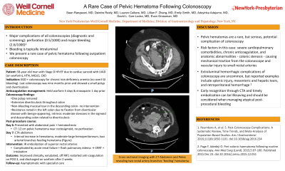 The main complications of colonoscopies are perforation and major bleeding, occurring at rates of 4 and 8 per 10,000 respectively. Bleeding is typically intraluminal; however, we present a case of a pelvic hematoma following an outpatient colonoscopy.