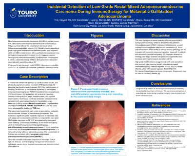 A low-grade rectal MANEC was incidentally identified on PET/CT in a stable patient undergoing systemic therapy for metastatic gallbladder adenocarcinoma. Although no direct link exists between immunotherapy and MANEC, checkpoint inhibitors may unmask indolent tumors or alter the tumor microenvironment, while improved survival and frequent imaging increase the likelihood of detecting secondary malignancies. Histology revealed superficially invasive adenocarcinoma and a well-differentiated neuroendocrine tumor within a tubular adenoma, with no high-risk features. Complete endoscopic resection was achieved, and conservative management was pursued. In contrast, high-grade MANECs with poorly differentiated neuroendocrine components are aggressive, requiring radical resection and platinum-based chemotherapy. Therapeutic options include FOLFOX, FLOT, S1 with cisplatin, XELOX, EP, IP, and streptozocin. This case emphasizes the need for diagnostic vigilance during surveillance in metastatic cancer patients.