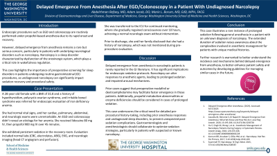 Discussion: Delayed emergence from anesthesia in narcoleptic patients is rarely reported in the GI literature. It has significant implications for endoscopic sedation protocols. Narcolepsy can alter responses to anesthetic agents leading to prolonged sedation and impaired arousal mechanisms. Prior cases suggest that preoperative modafinil or dextroamphetamine may facilitate faster emergence in those patients. Additionally, propofol metabolism abnormalities or enzyme deficiencies should be considered in cases of prolonged sedation. This case underscores the critical need for detailed pre-procedural history-taking, including prior anesthesia responses and undiagnosed sleep disorders, to prevent unexpected post-sedation complications. Gastroenterologists and anesthesiologists should collaborate to optimize sedation strategies, particularly in patients with suspected or known narcolepsy.