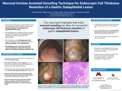 A 65-year-old male with history notable for tobacco use and seizure disorder was referred for management of a gastric SEL. Endoscopic ultrasound (EUS) demonstrated a 11 mm x 5 mm hypoechoic lesion originating from the submucosa (layer III) of the gastric body. Prior fine needle biopsies were non diagnostic. Endoscopic exam with white light imaging showed a 11 mm SEL with negative pillow sign (Figure 1A). Initial mucosal incision was performed with an endoscopic submucosal dissection (ESD) knife to unroof the underlying lesion (Figure 1B). Exposure of the lesion beneath the mucosal surface allowed for direct grasping of the lesion with the grasping forceps, retraction into the FTRD cap, and subsequent full thickness resection using the FTRD. Full thickness resection was demonstrated by the fatty patch within the clip and the specimen was successfully retrieved (Figure 1C). Lesion histopathology showed pancreatic heterotopia involving the submucosa with focal mucosal erosion (Figure 1D). There were no adverse events associated with the procedure.