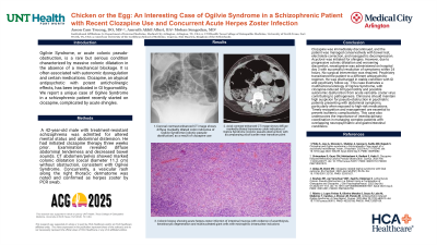 Ogilvie Syndrome, or acute colonic pseudo-obstruction, is a rare but serious condition characterized by massive colonic dilatation in the absence of a mechanical blockage. It is often associated with autonomic dysregulation and certain medications. Clozapine, an atypical antipsychotic with potent anticholinergic effects, has been implicated in GI hypomotility. We report a unique case of Ogilvie Syndrome in a schizophrenic patient recently started on clozapine, complicated by acute shingles.