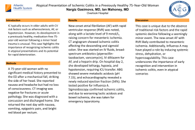 A 75-year-old woman with no significant medical history presented to the emergency department (ED) after a mechanical fall, striking the side of her head. She reported nausea and headache but had no loss of consciousness. CT imaging was negative for fractures or acute pathology. She was diagnosed with a concussion and discharged home. She returned the next day with nausea, vomiting, epigastric pain, and bright red blood per rectum. New-onset atrial fibrillation (AF) with rapid ventricular response (RVR) was noted, along with a lactate level of 9 mmol/L, raising concern for mesenteric ischemia. CT angiogram showed ischemic colitis affecting the descending and sigmoid colon. She was started on IV fluids, broad-spectrum antibiotics (piperacillin-tazobactam, vancomycin), IV diltiazem for AF, and a heparin drip. On hospital day 2, she developed lethargy, hypoxia, and hypotension, requiring ICU transfer. ABG showed severe metabolic acidosis (pH 7.15), and echocardiography revealed a newly reduced ejection fraction (34%). She tested positive for Influenza A. Sigmoidoscopy confirmed ischemic colitis, and due to worsening lactic acidosis and bowel ischemia, she was taken for emergency laparotomy.