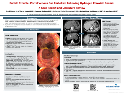 56-year-old male with no significant history presented with crampy abdominal pain, rectal pain and rectal bleeding after using a H₂O₂ enema for constipation. Vital signs were stable and physical exam revealed a soft abdomen with lower abdominal tenderness without guarding. Labs showed neutrophilic leukocytosis at 14.2, hemoglobin of 14.2 g/dL, normal anion gap metabolic acidosis, lactate of 0.9 mmol/L, and CRP of 12 mg/L. CT abdomen showed extensive portal venous gas in both hepatic lobes and mesenteric venous gas in the sigmoid mesocolon, along with colonic wall thickening from the hepatic flexure to the rectum. He was diagnosed with chemical colitis and venous air embolism secondary to H₂O₂ enema. Colonoscopy using a water immersion technique was done, revealing congested, erythematous, friable, inflamed and ulcerated mucosa throughout the colon. Biopsy confirmed acute colitis with ulceration. The patient was treated with IV fluids, broad-spectrum antibiotics and hyperbaric oxygen (HBO) therapy. Follow-up CT after 4 days showed resolution of venous gas but persistent colitis. He was discharged on oral antibiotics with GI follow-up.