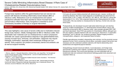 Histopathology showed transmural defects, mural abscesses, and foreign body granulomata containing resin material, consistent with cholestyramine or sodium polystyrene sulfonate. One month after discharge, she was readmitted with an anastomotic leak and underwent interventional radiology-guided drain placement and outpatient follow up.