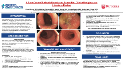Cyclin-dependent kinase 4/6 (CDK4/6) inhibitors are standard for HR+, HER2-negative advanced breast cancer. While generally well-tolerated, their adverse event profiles differ. Palbociclib is primarily linked to hematologic toxicity, with severe gastrointestinal toxicities like colitis being rare and underrecognized. Colitis presents a diagnostic challenge due to symptom overlap with infectious and inflammatory bowel diseases.