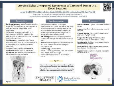 A 67-year-old male with a history of hypertension and a prior right hemicolectomy for a carcinoid tumor (2008) presented for routine healthcare maintenance. Elevated screening prostate-specific antigen (PSA) prompted an MRI of the prostate, which revealed findings suggestive of prostate cancer and incidentally identified a 4.7 cm lobulated, enhancing soft tissue lesion contiguous with the seminal vesicles and sigmoid colon. Biopsy confirmed prostate adenocarcinoma. Subsequent workup with PET scan showed a non-tracer avid 3 x 5 cm soft tissue attenuation near the seminal vesicle, and colonoscopy was unremarkable. Further investigation with endoscopic ultrasound revealed a 5 x 3.5 cm hypo echoic, solid peri-colonic mass 15 cm from the anal verge, which was confirmed by fine-needle aspiration to be a recurrence of the patient's known carcinoid tumor.