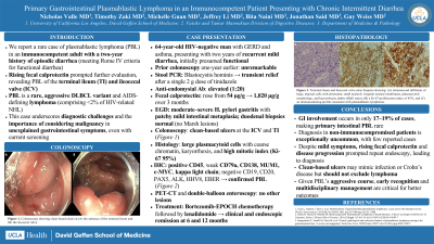 A 64-year-old HIV-negative male with GERD and asthma reported recurrent mild diarrhea over two years, initially presumed functional. Colonoscopy one year prior was unremarkable. Stool PCR detected Blastocystis hominis, with transient relief from metronidazole. Anti-endomysial antibodies were elevated. Fecal calprotectin rose significantly from borderline (54 µg/g) to markedly elevated (1020 µg/g) over three months. Upper endoscopy revealed moderate to severe H. pylori gastritis with patchy mild intestinal metaplasia; duodenal biopsies were normal with no celiac disease. Colonoscopy revealed clean-based ulcers at the ileocecal valve and terminal ileum. (Figure 1). Biopsies showed large, plasmacytoid cells with coarse chromatin, small nucleoli, karyorrhectic debris, and high mitotic index (Ki-67: 95%). Immunostaining was positive for CD45, weak CD79a, CD138, MUM1, c-MYC, and kappa light chain; negative for CD19, CD20, PAX5, ALK, HHV8, and EBV-encoded RNA (Figure 2), confirming PBL. PET-CT and double balloon enteroscopy showed no other lesions. Treatment with Bortezomib-EPOCH chemotherapy followed by lenalidomide induced clinical and endoscopic remission.