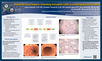 However, management for presumed IBS-C was unsuccessful with worsening abdominal pain, diarrhea, poor oral intake, and hematochezia. CT imaging revealed new colonic wall thickening from the distal ascending colon to the rectosigmoid wall. Colonoscopy demonstrated severe segmental inflammation with friability and ulceration from the hepatic flexure to the distal descending colon. Biopsies showed non-specific focal active colitis. Fecal calprotectin was normal. Evaluation was unremarkable for infectious, thyroid, and allergy etiologies. Three months later, due to persistent symptoms, a repeat colonoscopy revealed numerous pseudopolyps and biopsies demonstrated up to 50 eosinophils/hpf infiltration without other inflammatory changes. Given that secondary causes were ruled out, the patient was diagnosed with EoC. The patient’s symptoms improved with prednisone but only partially responded to a transition to budesonide.