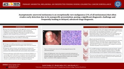 A 57-year-old man with a first-degree family history of colorectal cancer underwent screening colonoscopy in 2019, which revealed diverticulosis, non-bleeding hemorrhoids, and a small hyperplastic polyp. A five-year follow-up was recommended. On repeat colonoscopy in April 2024, a 20 mm sessile polyp was noted at the anorectal junction and was removed. Histopathology revealed sheets of atypical melanocytic cells with prominent nucleoli and brisk mitosis. Immunohistochemical staining was positive for S100, SOX10, HMB-45, MART-1, CD10, and focal CD117, which is consistent with malignant melanoma. Glandular dysplasia was not observed.