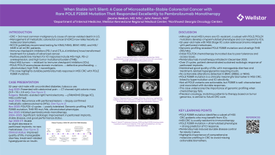 A 52-year-old man with uncontrolled diabetes and tobacco use presented with abdominal pain and was found to have a large right colonic mass causing obstruction. He underwent urgent hemicolectomy, which revealed a 9.8 cm, moderately differentiated adenocarcinoma invading the terminal ileum with negative lymph nodes and margins. Initially staged as non-metastatic MSS disease, he later developed peritoneal metastases. He began FOLFOX chemotherapy but genomic testing revealed an ultramutated tumor with TMB of 193 mut/Mb and a pathogenic POLE P286R mutation. Therapy was switched to pembrolizumab, resulting in immediate symptom relief and radiologic improvement, highlighting the impact of immunotherapy in MSS tumors with POLE mutations.