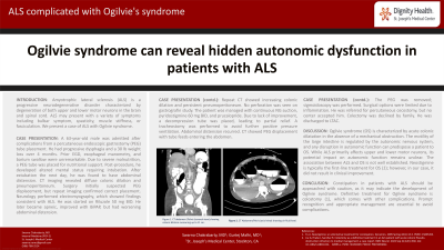 OS involves acute colonic dilation in the absence of mechanical obstruction, likely due to autonomic dysregulation. Though ALS primarily targets UMN and LMN. The relationship between ALS and OS is poorly defined. Pyridostigmine was tried but showed limited effectiveness. Constipation in patients with ALS should be approached with caution, as it may indicate the development of Ogilvie syndrome.