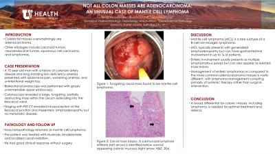 A 70-year-old man with a history of coronary artery disease and longstanding iron deficiency anemia was referred for evaluation of abdominal pain, worsening anemia, and unintentional weight loss. As part of his workup, both esophagogastroduodenoscopy (EGD) and colonoscopy were performed. The EGD was grossly unremarkable. However, colonoscopy revealed a large, fungating, and partially obstructing mass within the cecum extending into the ileocecal valve. Biopsies of the lesion confirmed the unexpected diagnosis of mantle cell lymphoma. Further staging with PET-CT revealed intussusception at the ileocecal junction and mesenteric lymphadenopathy, but no evidence of distant metastatic disease. Given the lack of obstructive symptoms, surgical intervention was deferred. The patient was managed with rituximab, lenalidomide, and localized cecal radiation and showed favorable clinical response.