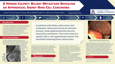 Appendiceal cancers are rare and often diagnosed incidentally after surgery for appendicitis. Our case is notable for its initial presentation as biliary obstruction, a pattern typically seen with cholangiocarcinoma or pancreatic cancer. The signet-ring cell subtype, known for aggressive behavior and diffuse peritoneal spread, initially mimicked gynecologic malignancies, further complicating diagnosis.