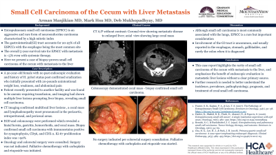 Extrapulmonary small cell carcinoma (EPSCC) is an aggressive and rare form of neuroendocrine carcinoma characterized by a high mitotic index. The gastrointestinal (GI) tract accounts for 20-25% of all ESPCCs with the esophagus being the most common site. The overall 5-year survival rate for EPSCC with metastasis is < 5% even with systemic therapy. Here we present a case of biopsy-proven small cell carcinoma of the cecum with metastasis to the liver.