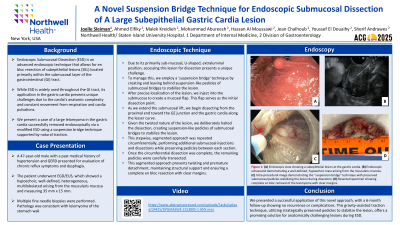 Endoscopic Submucosal Dissection (ESD) is an advanced endoscopic technique that allows for en bloc resection of subepithelial lesions located within the submucosal layer of the gastrointestinal (GI) tract. While ESD is widely used throughout the GI tract, its application in the gastric cardia presents unique challenges due to the cardia’s anatomic complexity and constant movement from respiration and cardia pulsations.We present a case of a large leiomyoma in the gastric cardia successfully removed via a modified ESD using a suspension bridge technique supported by natural traction.