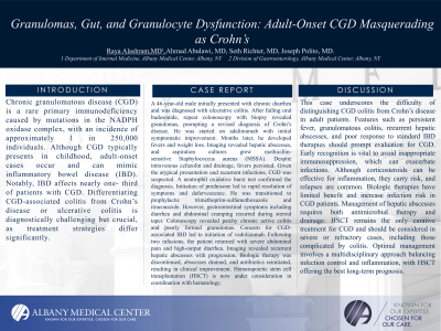 This case highlights the challenge of distinguishing CGD colitis from Crohn’s disease in adults. Key signs like persistent fever, granulomas, and recurrent liver abscesses should raise suspicion for CGD. Early diagnosis is critical to avoid harmful immunosuppression. While corticosteroids may help, relapse is common, and biologics increase infection risk. Hepatic abscesses need antibiotics and drainage. Hematopoietic stem cell transplantation (HSCT) is the only cure and should be considered for severe cases. Effective management requires a multidisciplinary approach to balance infection control with inflammation treatment.