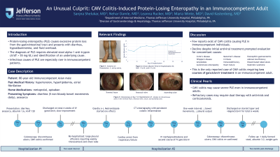 Protein-losing enteropathy (PLE) is excessive protein loss via the gastrointestinal tract causing diarrhea, hypoalbuminemia, and fluid overload. Diagnosis is supported by elevated stool alpha-1 antitrypsin (A1AT). The extensive differential diagnosis includes infections such as Whipple’s disease and opportunistic pathogens (Figure 1). We present a rare case of cytomegalovirus (CMV) colitis causing severe PLE in an immunocompetent patient.