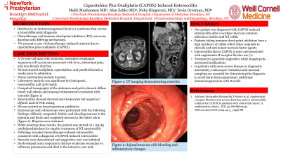 Our patient with fever and diarrhea was diagnosed with CAPOX induced enterocolitis after a workup ruled out common infectious entities and ICI colitis. Patients taking immune check point inhibitors have a high incidence of colitis which often responds to steroids and anti-tumor necrosis factor agents. Enterocolitis due to CAPOX is rare and associated with concurrent angiotensin II receptor blocker use. Treatment is generally supportive. In patients with more severe disease, endoscopic evaluation and mucosal biopsies are essential for determining the diagnosis to avoid further harm from unnecessary additional immunosuppression with steroids.