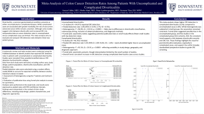 Diverticulitis, a common gastrointestinal condition, presents as either uncomplicated or complicated disease. While complicated cases are associated with greater morbidity, the risk of concurrent colorectal cancer (CRC) remains uncertain. Although some studies suggest a link between diverticulitis and increased CRC risk, comparative data on cancer detection rates in uncomplicated versus complicated cases are limited. This meta-analysis aims to evaluate and compare CRC detection rates between these two patient groups.