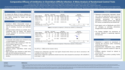The meta-analysis included four randomized controlled trials, encompassing a total of 1,368 patients. In terms of clinical cure, the results indicated no statistically significant difference between vancomycin and fidaxomicin or other emerging antibiotic agents, with an odds ratio (OR) of 1.03 (95% confidence interval [CI]: 0.78–1.35; I² = 76%). However, when evaluating recurrence rates, fidaxomicin and other novel therapies demonstrated a significantly greater reduction in recurrence compared to vancomycin, with an OR of 0.46 (95% CI: 0.33–0.64; I² = 44%).