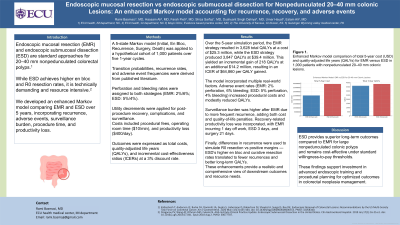 Endoscopic mucosal resection (EMR) and endoscopic submucosal dissection (ESD) are standard approaches for 20–40 mm nonpedunculated colorectal polyps. While ESD achieves higher en bloc and R0 resection rates, it is technically demanding and resource intensive. We developed an enhanced Markov model comparing EMR and ESD over 5 years, incorporating recurrence, adverse events, surveillance burden, procedure time, and productivity loss.