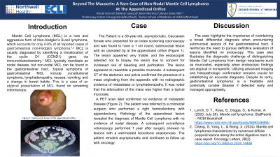 Mantle Cell Lymphoma (MCL) is a rare and aggressive form of Non-Hodgkin’s B-cell lymphoma, which accounts for only 4-9% of all reported cases of gastrointestinal Non-Hodgkin’s lymphoma. MCL is usually diagnosed by identifying a translocation of the CCND1 gene via immunohistochemistry. MCL is typically manifested as nodal disease, but non-nodal MCL can be found in the gastrointestinal tract. Typical symptoms of gastrointestinal MCL include constitutional symptoms, lymphadenopathy, nausea, vomiting, and change in bowel habits. This is a case of an atypical presentation of MCL found on screening colonoscopy.