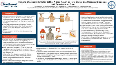 A 61-year-old male with metastatic melanoma underwent treatment with pembrolizumab. During therapy, he developed persistent flu-like symptoms unresponsive to NSAIDs and was given multiple steroid courses to manage and prevent recurrence of his symptoms. A few weeks after completion of ICI therapy, and while rapidly tapering a steroid course, he presented to the emergency department with severe dehydration, confusion, and abdominal pain. Initial workup showed signs consistent with diabetic ketoacidosis (DKA), as well as abnormal thyroid and adrenal function tests, raising concerns for multiple endocrine irAEs. He was stabilized and discharged on high-dose steroids with instructions for a gradual taper. A few weeks later, he presented with 15–20 episodes of non-bloody diarrhea. Despite the severity of symptoms, colonic mucosa looked normal, with no gross evidence of inflammation. However, biopsies revealed severe active colitis, increased intraepithelial lymphocytes, cryptitis, and crypt abscesses, findings consistent with ICI colitis. High-dose corticosteroids were restarted again, resulting in improvement of symptoms, with instructions for a slow, careful taper to minimize risk of relapse.